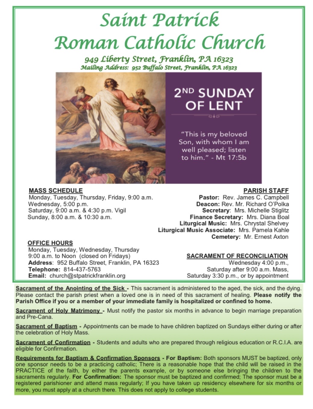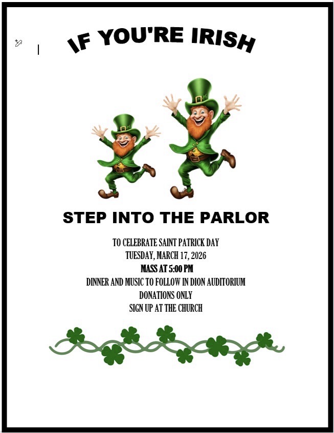 The Mass for Tuesday, March 17, St. Patrick's Day, has been changed from 9 a.m. to 5 p.m. with a 4 p.m. Holy Hour.