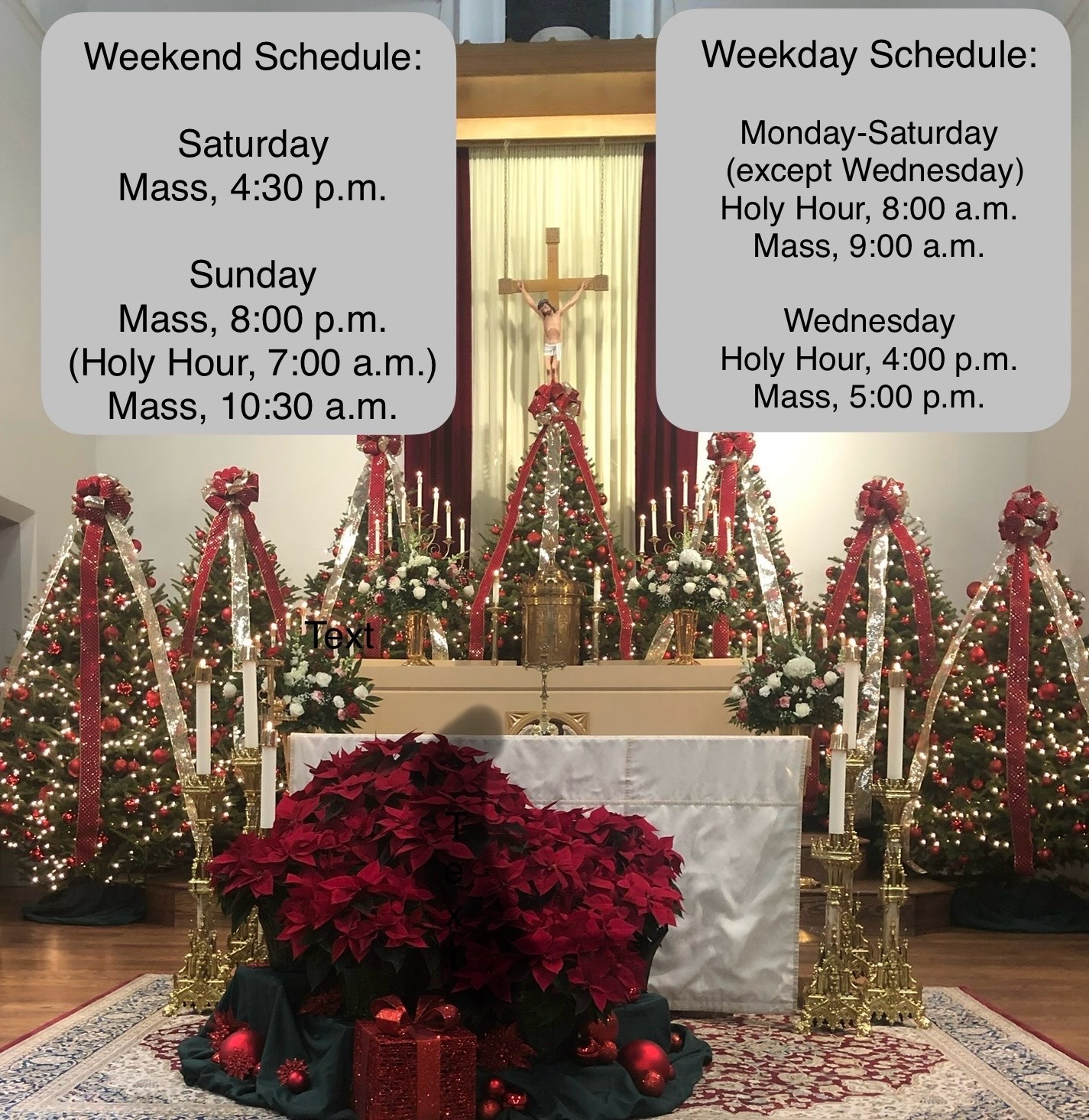 The Mass schedule for the Solemnity of Mary, Mother of God, January 1st, a Holyday of obligation is as follows:Wednesday, December 31-