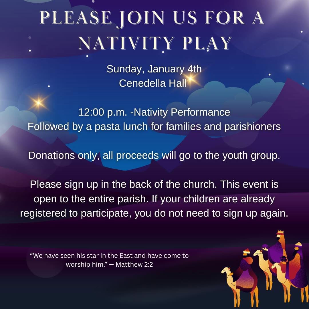 Please note this change from the usual Holyday schedule. There is no Mass at 7:00 p.m. on New Year’s Day.